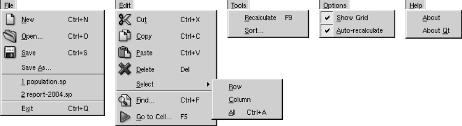 В Qt все меню являются экземплярами QPopupMenu. Мы создали меню "File" и затем