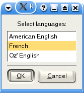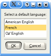 $ kdialog --radiolist "Select a default language:" 1 "American \ English" off 2 French on 3 "Oz' English" off |