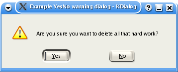 kdialog --title "Example YesNo warning dialog" --warningyesno "Are \ you sure you want to delete all that hard work?" |