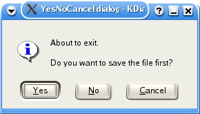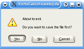 kdialog --title "YesNoCancel warning dialog" --warningyesnocancel \ "About to exit.\n Do you want to save the file first?" |