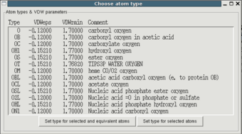 The user can choose types and VDW parameters from a list of atom types