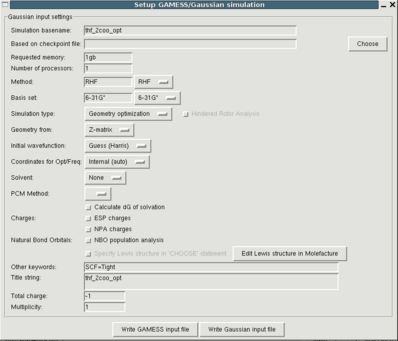 You can obtain the respective interface through the "File->Setup QM optimization". The meaning of the buttons can be found here. In most cases the default values provided by Paratool should be fine, but it is important that you check the total charge and the multiplicity since these are difficult or impossible to guess automatically. a good choice for the simulation method and the basis set are RHF/6-31G* and UB3LYP/6-31+G* for metal containing molecules.