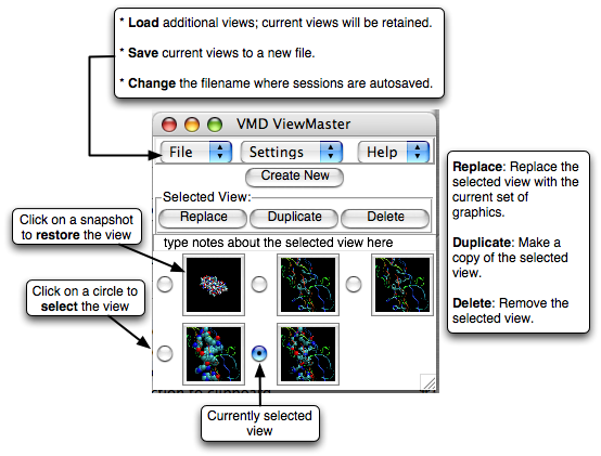 Use ViewMaster with VMD as you normally would to create pictures of your molecules. When you have a view you would like to preserve, open the ViewMaster window from the Extensions pulldown menu and press the "Create New" button. A small screenshot of the current graphics will be generated and placed into the ViewMaster window below the main row of buttons. Use the "Create New" button to create as many views as you want. To switch between saved views, click on the snapshot corresponding to the view you want. All the molecular representations you used to create the view, as well as the orientation and most other VMD options, will be restored. To help yourself remember what the different views were for, you can type a note into the Notes entry, just below the buttons and above the saved snapshots. You can have a different note for each view. Recall the clicking a screenshot restores the view. It also selects the view, which is indicated by the circle next to each snapshot. To select a view without restoring the graphics, press the circle instead of the snapshot. The circle next to each view lets you select the view for various operations. The Replace button replaces the selected view with the current VMD graphics. The Duplicate button makes a copy of the view and adds it to the list. The Delete button deletes the selected view.