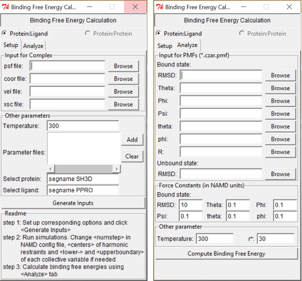 Post-treatment. BFEE calculates the binding free energy as well as the contribution of each degree of freedom automatically. As shown in Figure 1, only the free-energy profile at each step of the workflow (usually czar.pmf) is needed as input if default force constants are used for the geometric restraints. The results of the free-energy calculation will be shown after clicking the button “Compute Binding Free Energy”. (Be careful about setting r*. It should be less than rmax in the separation step)
