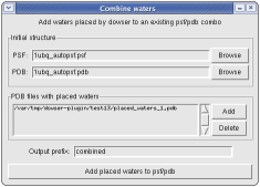 If you have a psf/pdb combo and wish to add the waters placed by dowser, you can do so by clicking File->Combine waters... The plugin keeps track of all waters placed by Dowser in the current session. Thus you can, for example, run dowserx followed by a series of runs of dowser-repeat, and then combine the waters placed in all runs at once.
