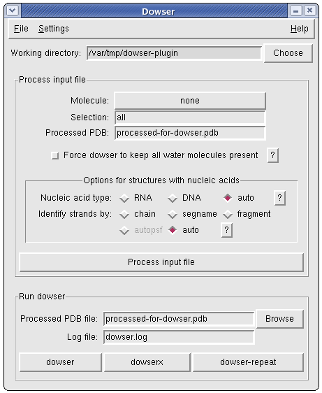 The Dowser plugin can be used to process a pdb file for use with Dowser, a program that finds cavities in proteins and solvates them according to an energy criterium. You will need to install Dowser yourself. Please refer to the Dowser manual. In the instructions you will find that you need to source 'dowserinit' before running dowser.