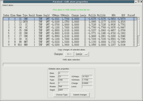 The first property you want to set is the residue name (Rname). Select all atoms and type a name in the adequate field, confirming with "Submit". Make sure that the residue name is unique among the topology files you are planning to use. The residue number (Resid) and the segment ID (Segid) are only relevant for transition metal complexes and iron-sulfur clusters but they must be identical for all atoms of a model compound. If you are unhappy with the default atom names from you can change them but each name must be unique in a residue. Also note that atom names and the aforementioned strings should be in capital letters.
